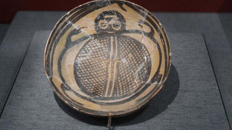 这是4000多年前的一件蛙纹彩陶钵。
