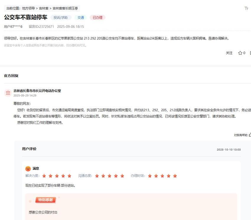 问题取得贬责,网友为相关部门的办实事速率和力度,给出了五星好评:“感谢公交公司的付出。”