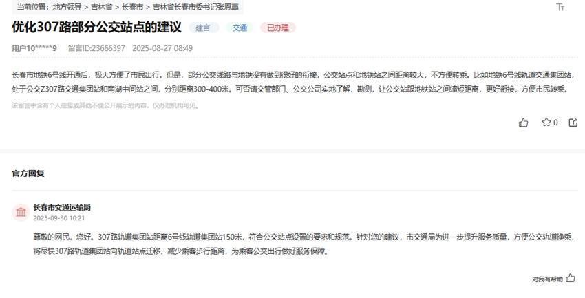 “长春市地铁6号线绽开明,极大浅近了市民出行。可是,部分公交浮现与地铁莫得作念到很好地相接,公交站点和地铁站之间距离较大,不浅近转乘。比如地铁6号线轨说念交通集团站,处于公交Z307路交通集团站和南湖中间站之间。可否请交管部门、公交公司实地了解、勘察,让公交站跟地铁站之间裁减距离,更好相接,浅近市民转乘。”长春网友给长春市委文书留言称。