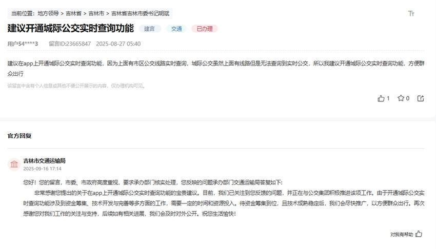 “提议在App上绽开城际公交及时查询功能。现在App上头有市区公交浮现及时查询,城际公交固然上头有浮现,可是无法进行及时查询。提议绽开城际公交及时查询功能,浅近大家出行。”吉林市网友给吉林市委文书留言中写说念。