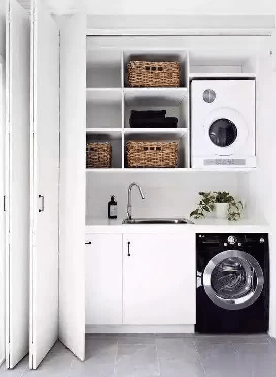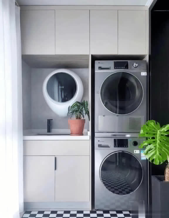 洗衣和烘干机组合柜的诡计,在柜子一侧单独预留摈弃洗衣机和烘干机的空间,上方的舒畅之处安设或是定制一组收纳柜刚刚好,把普通不常用的杂物都放进去。