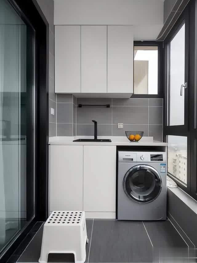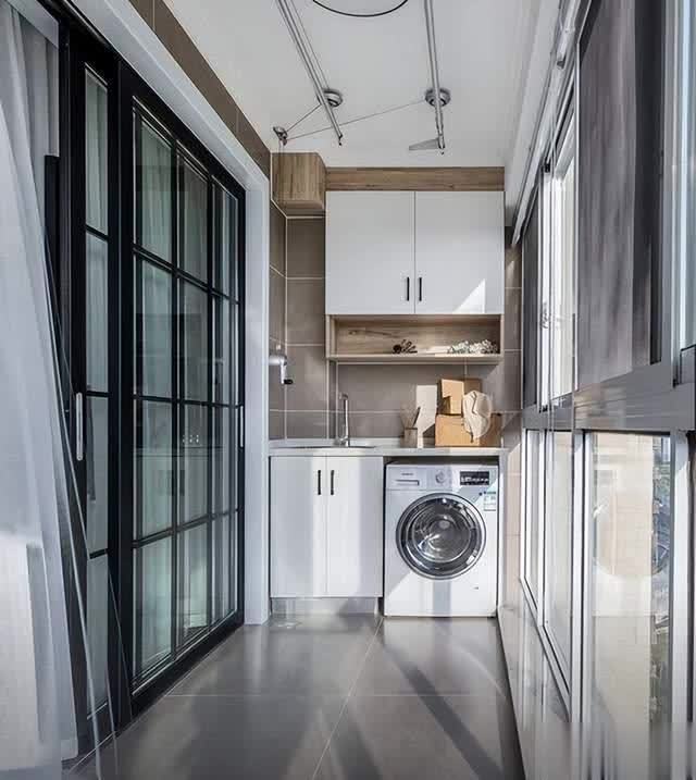 不错在洗衣柜上头作念层架或者吊柜组合,安设一个折叠门,既增多了收纳,也确保了阳台的好意思不雅性。