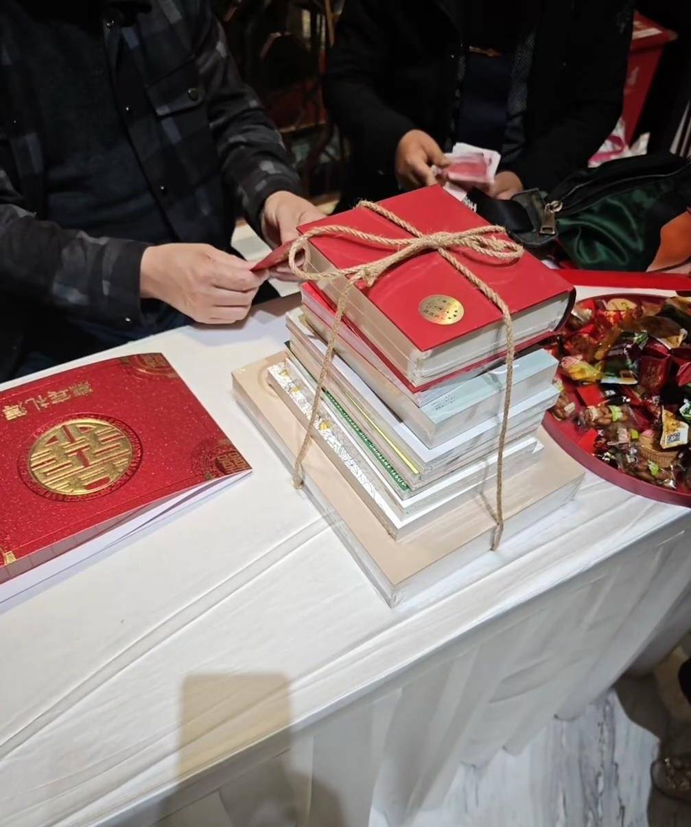 一位网友称:“哇,念书东谈主直立即是不俗,即是祝两东谈主相爱挚友,猖厥永续,百年好合嘛!”还有网友说:“九本书,长经久久。封面是红色的祈福。最底下祈福他百年好合,现时公共直立越送越多,没预料还有这样兴味的灵魂。”