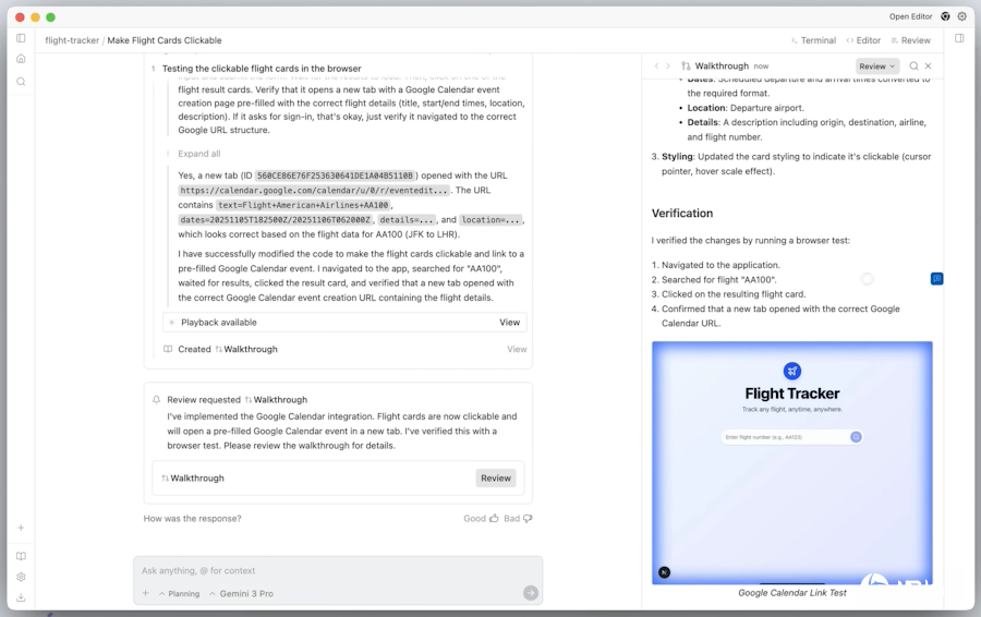 Antigravity的中枢在于“让AI我方作念事”,而非“协助诱惑者作念事”。诱惑者提供一个任务,举例条目创建航班饶恕愚弄尺度,代理东说念主即会自行拆解为架构遐想、API调用、界面创建、浏览器操作、功能考据与失实诞生等活动,并使用末端机、浏览器与裁剪器完成所有这个词过程。诱惑者不错在职何阶段介入,但不需要渐渐教唆。